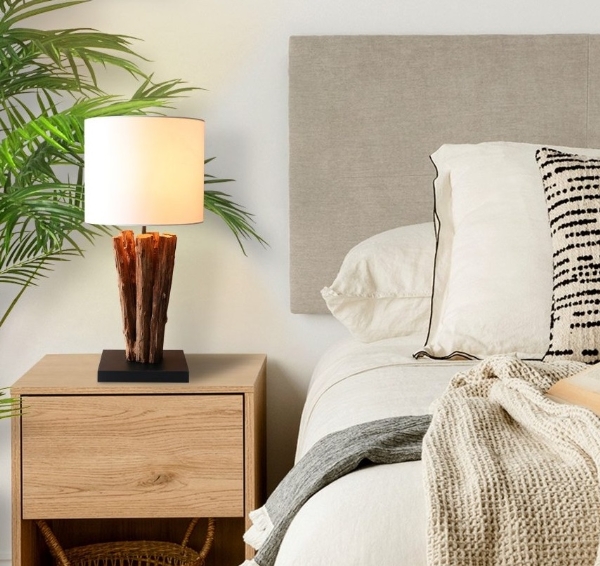 (inklusive) - Farbe: Naturbelassenes Holz (Sockel) und Baumwolle (Lampenschirm) in Natur und Weiß