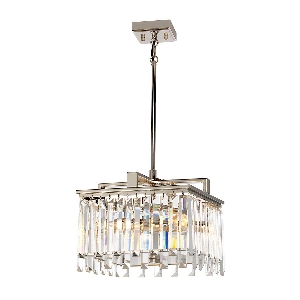 Aries hat eine kühne quadratische Armarchitektur, die in poliertem Nickel veredelt ist und mit hochwertigen geschliffenen Glaskristallen ergänzt wird. Eine weichere Opalglasbodenplatte kontrastiert mit lose hängenden abwechselnden Seitenkristallen, die einen spielerischen Lichteffekt bieten.